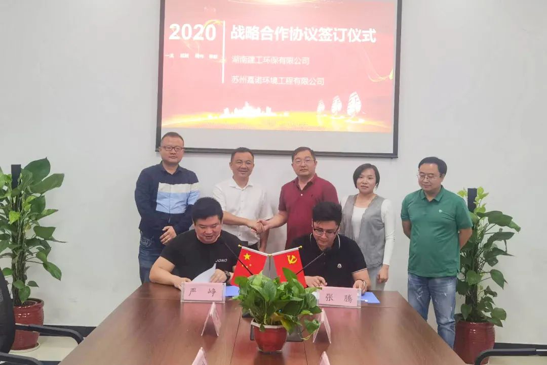 9月17號下午,湖南建工環保有限公司(以下簡稱“湖南建工環保”)與蘇州嘉諾環境工程有限公司(以下簡稱“我司”)舉行簽約儀式。湖南建工環保董事長徐劍、副總經理張騰、副總經理胡美霞、固廢運營部部長喻杰與我司董事長袁靖、設計研究院副院長嚴崢、湖南區域經理仇佳出席簽約儀式。湖南建工環保副總經理張騰,我司設計研究院副院長嚴崢分別代表雙方簽約。